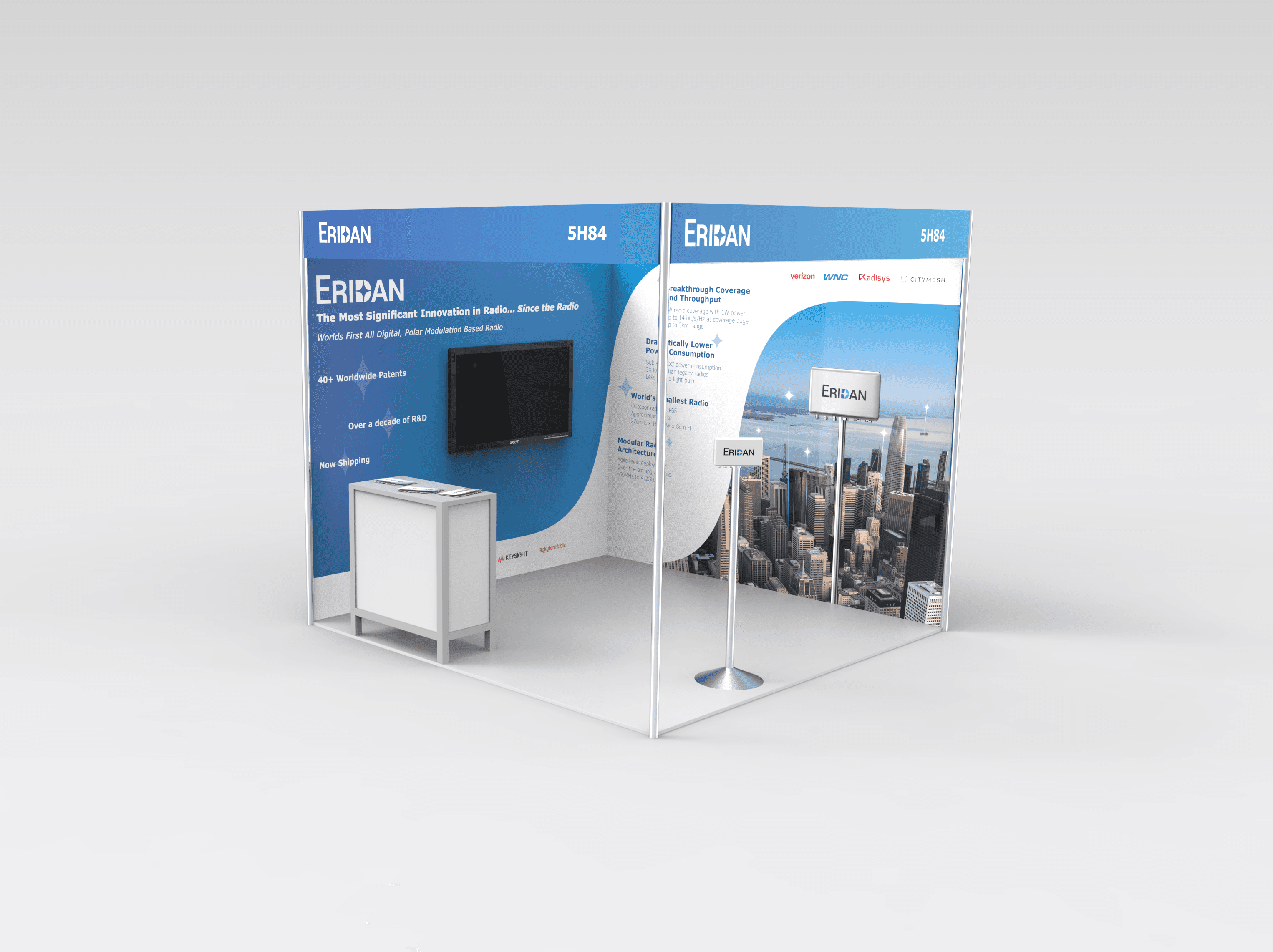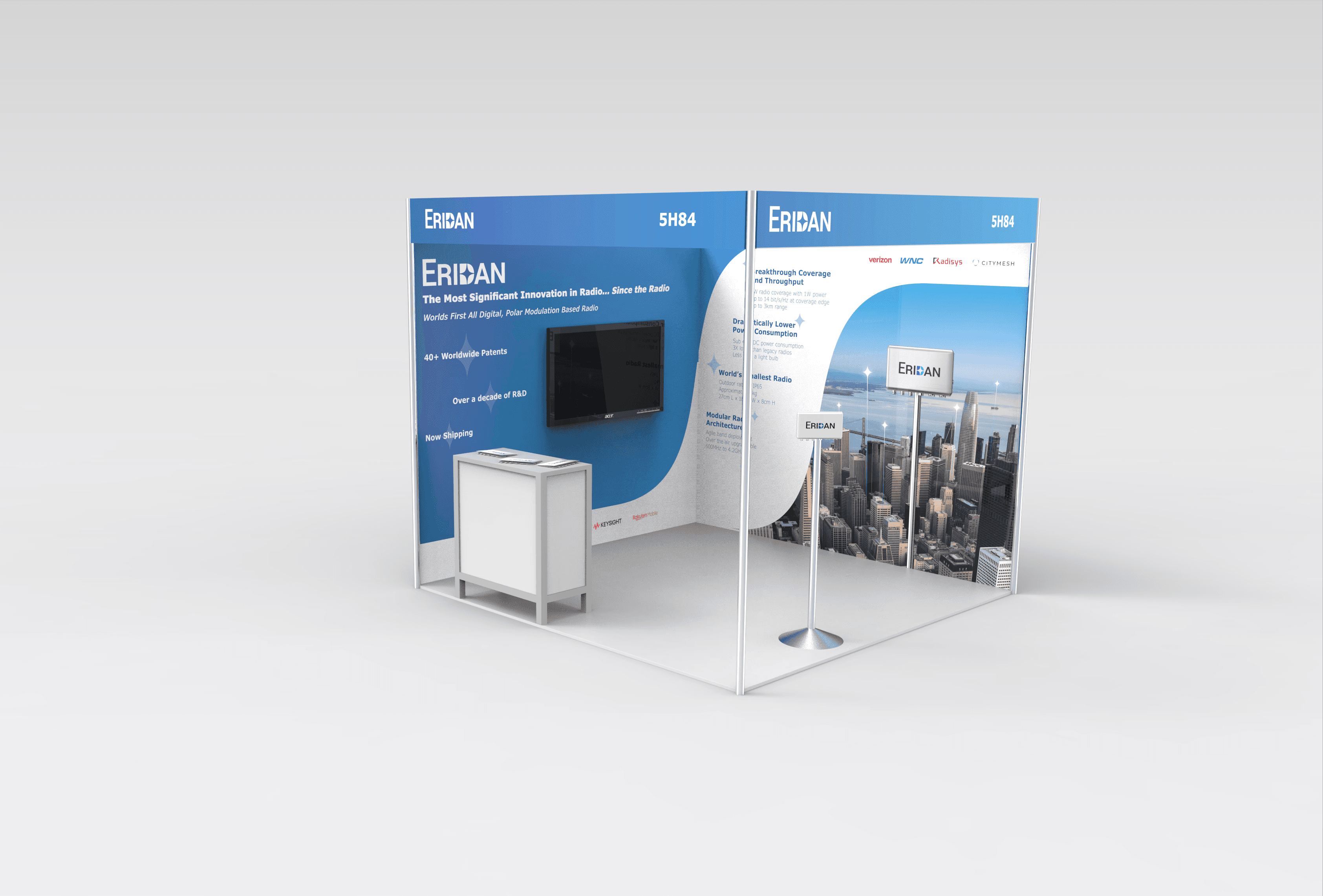 Despite a compact 600-square-foot footprint, the booth effectively showcases Eridan’s latest 5G radio and clearly communicates its key benefits. To ensure strong differentiation, the design consistently applies Eridan’s brand language through deep blues, wave forms, and constellation-inspired star elements tied to the Eridanus constellation.