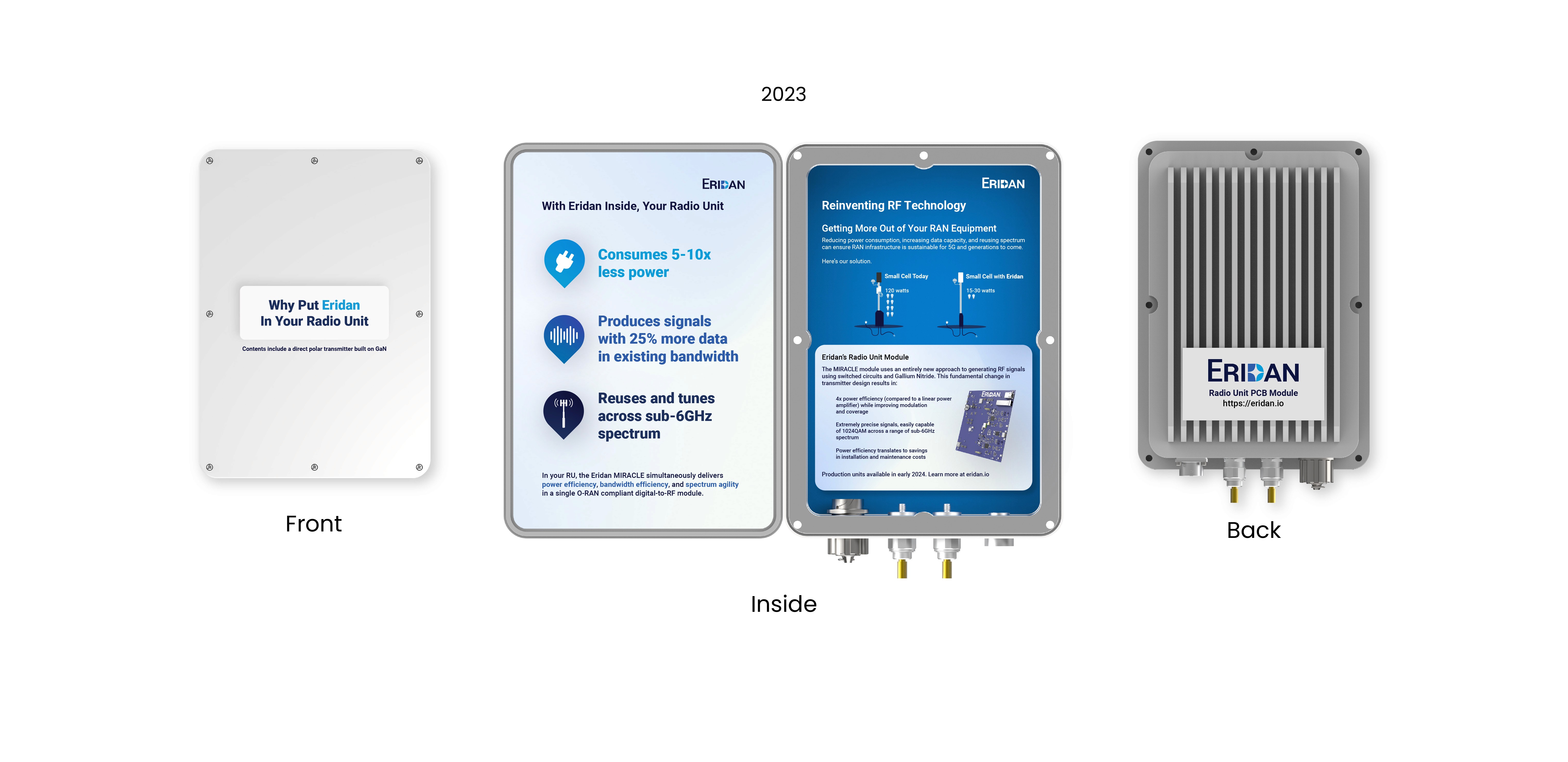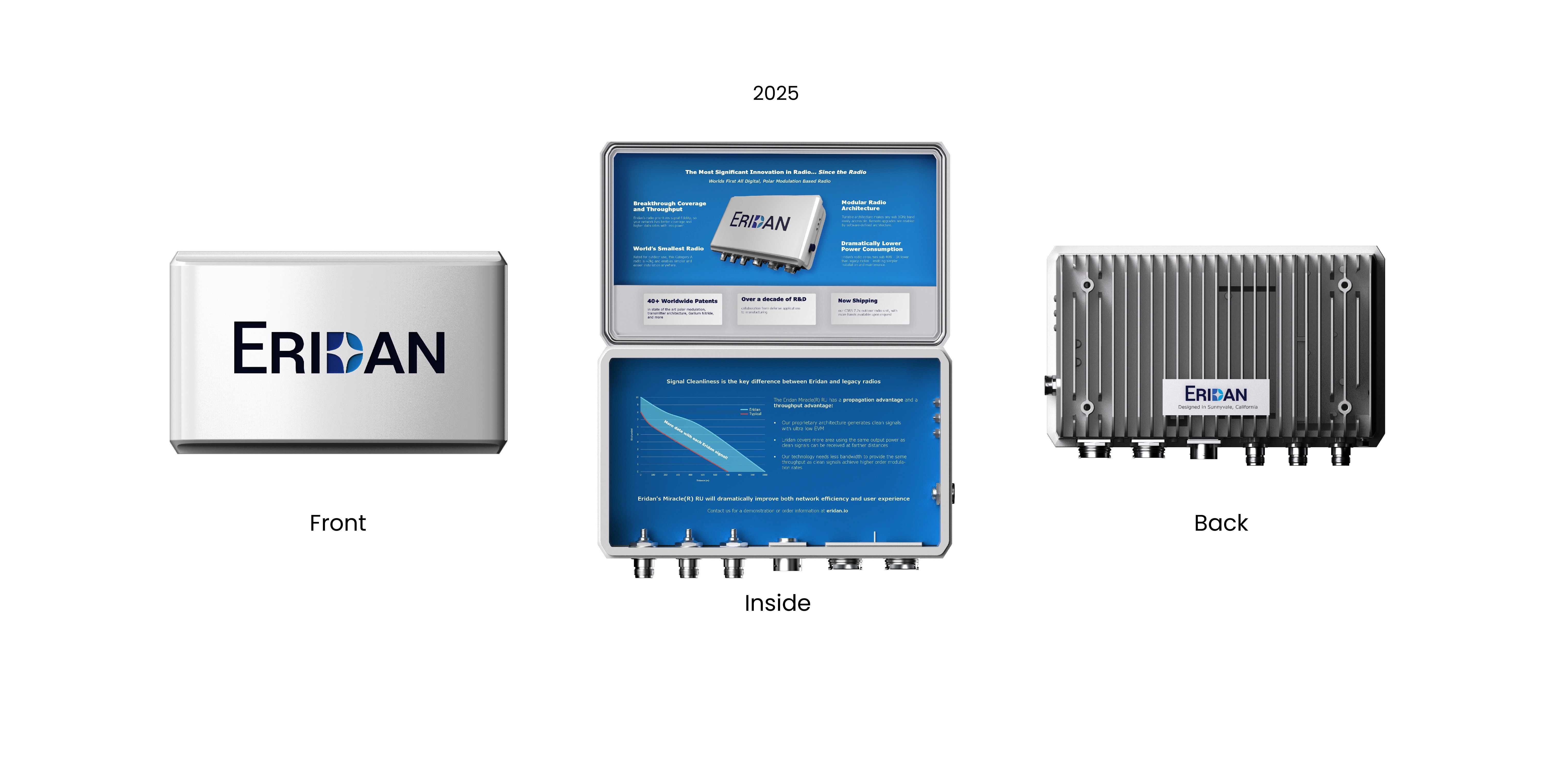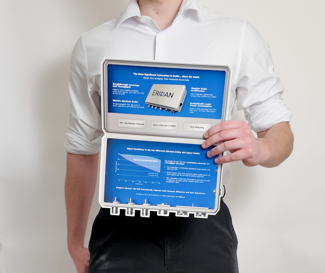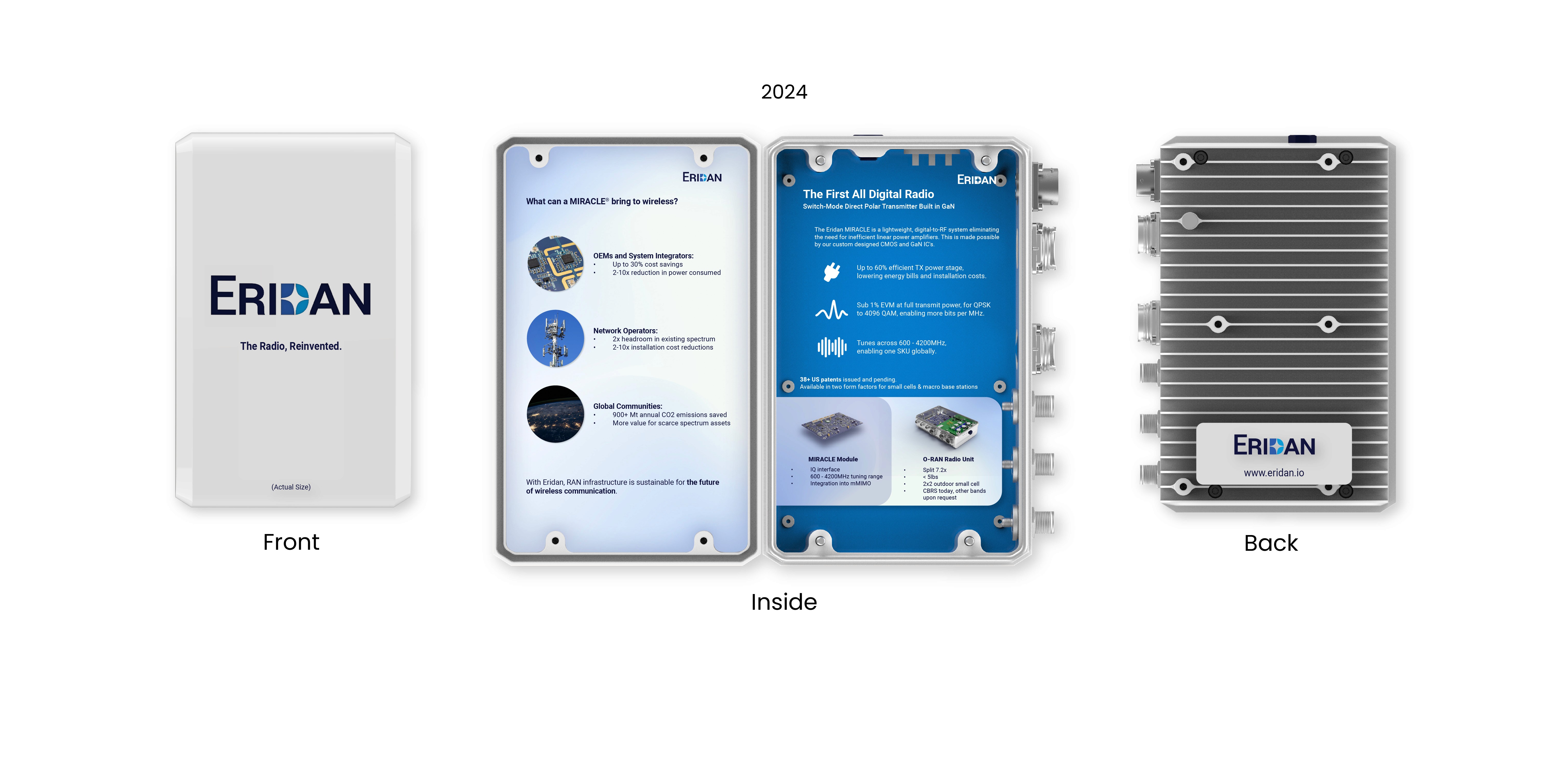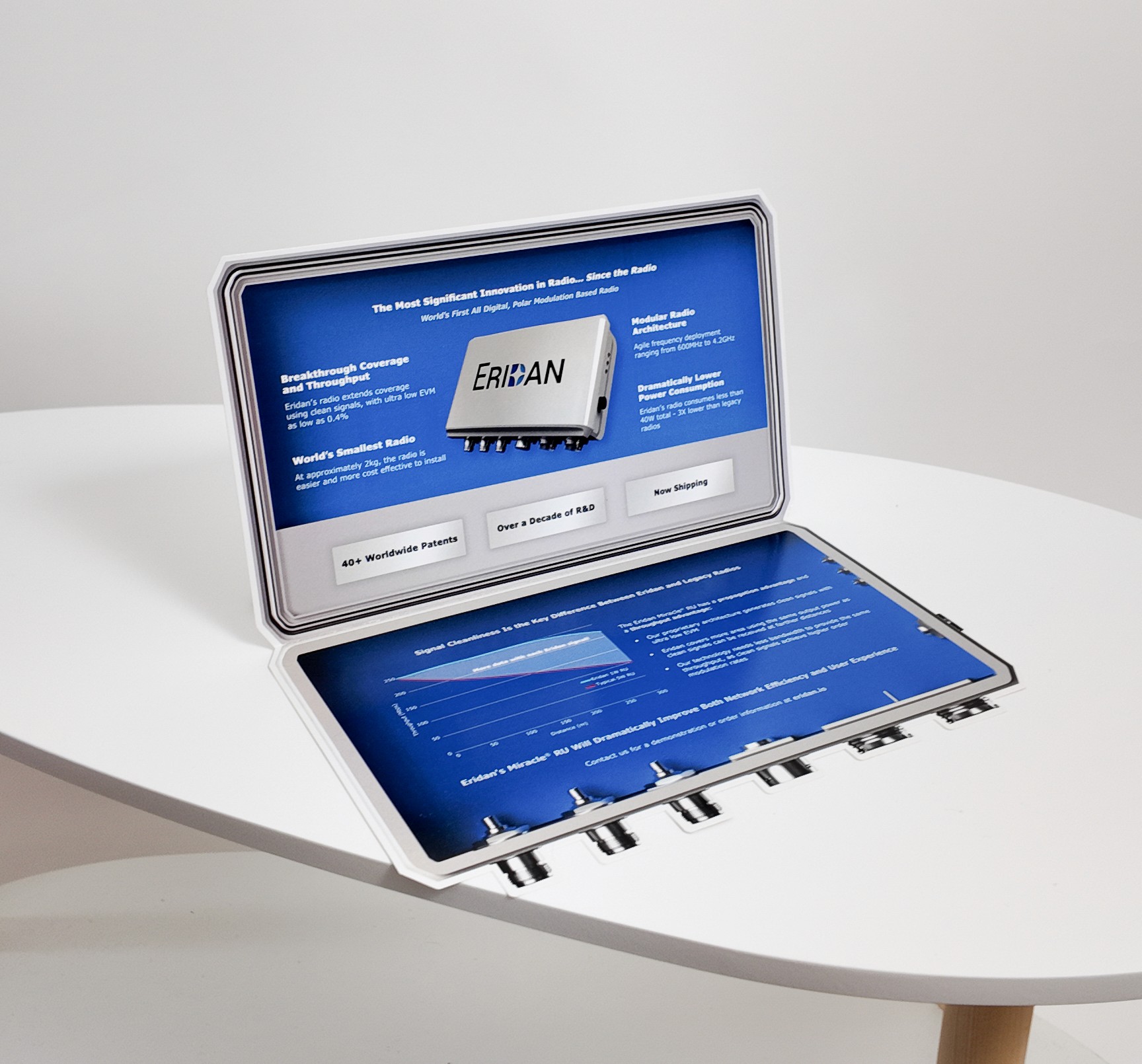 Printed at a true 1:1 scale, the brochure emphasizes how compact the radio unit is compared to competitors. with key company info and technical details inside, Eridan had 500 brochures printed and regularly circulates them at conferences today. Eridan uses this brochure as a one stop shop for communicating its technological advantages as clearly as possible.