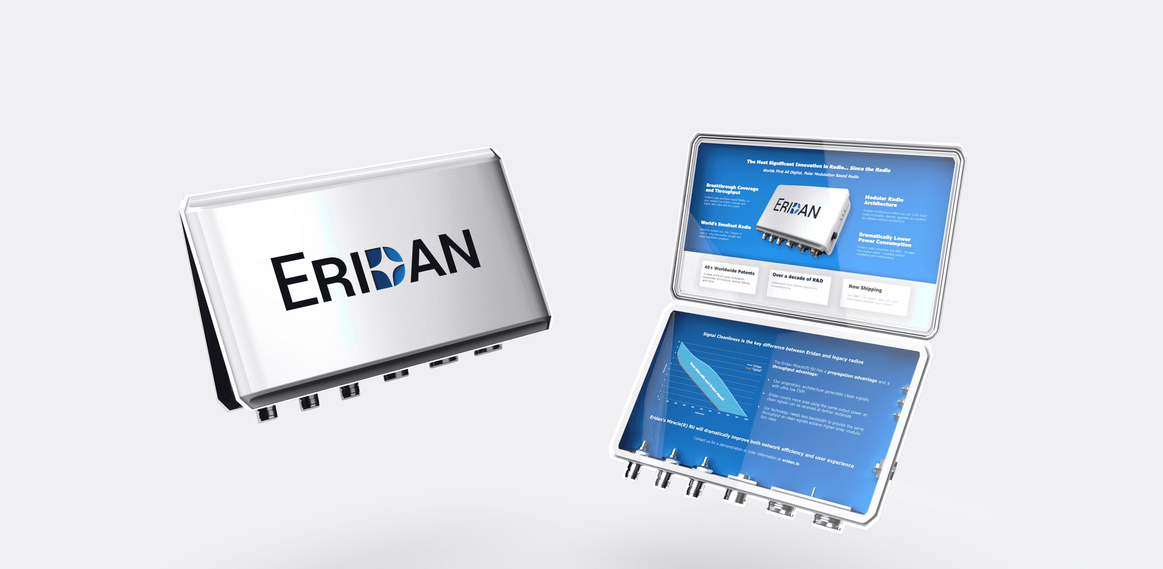 A unique take on the classic tradeshow brochure. Designed for MWC Barcelona 2025, this piece takes the form of Eridan’s radio unit at true 1:1 scale, instantly communicating how compact it is compared to competing products.
